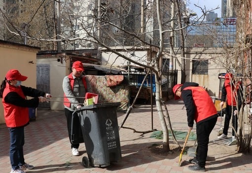 “下面的活儿咱们兵分两路,尚丽霞带领第一组打扫居民楼周围的杂草和楼道卫生,第二组清理楼房以及单元门上小广告……”分配完任务后大家马上开始分头行动。