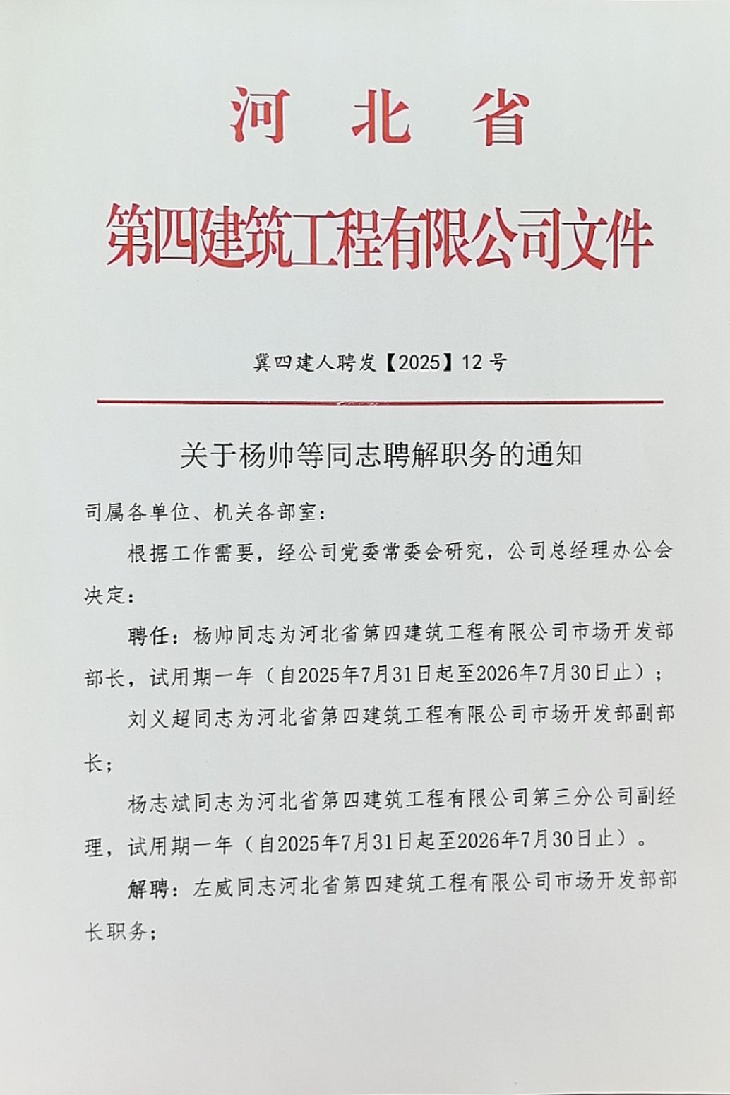 河北四建:关于尹玉石同志聘任职务的通知